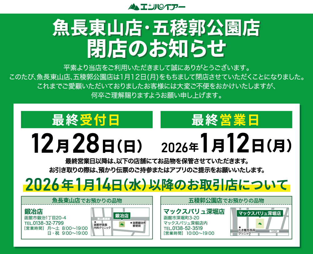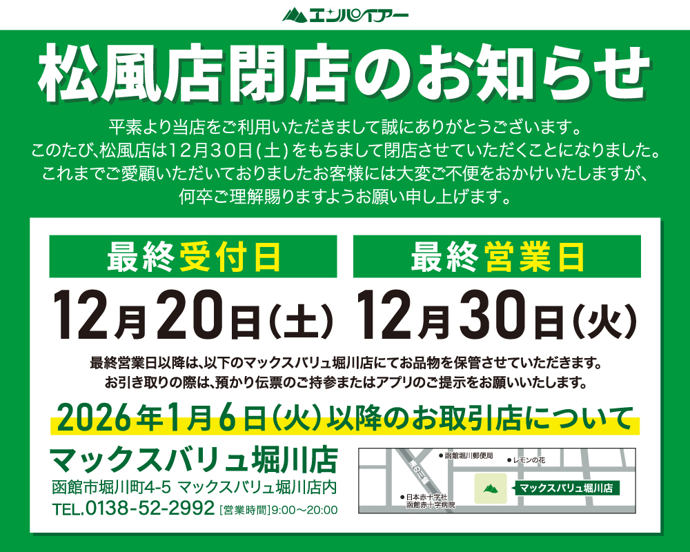 【店舗】閉店のお知らせ【函館市】 2025.12.01 いつもエンパイアーをご利用いただき誠にありがとうございます。誠に勝手ながら、函館市の3店舗を閉店させていただくこととなりました。長きに渡りご愛顧いただき誠にありがとうございました。また、皆様にはご不便をおかけすることを心よりお詫び申し上げます。「最終受付日」「最終営業日」等、詳しくは上部画像をご確認願います。何卒、引き続きのご愛顧の程、よろしくお願い申し上げます。 店舗詳細: 松風店 店舗詳細: 魚長東山店 店舗詳細: 五稜郭公園店 【鍛冶店】移転リニューアルオープンのお知らせ 【店舗】RARAポイント付与廃止について お盆期間営業時間のお知らせ Yシャツ回数券 通年販売終了のお知らせ 【アピア店】3/17 リニューアルオープン!!【店舗】