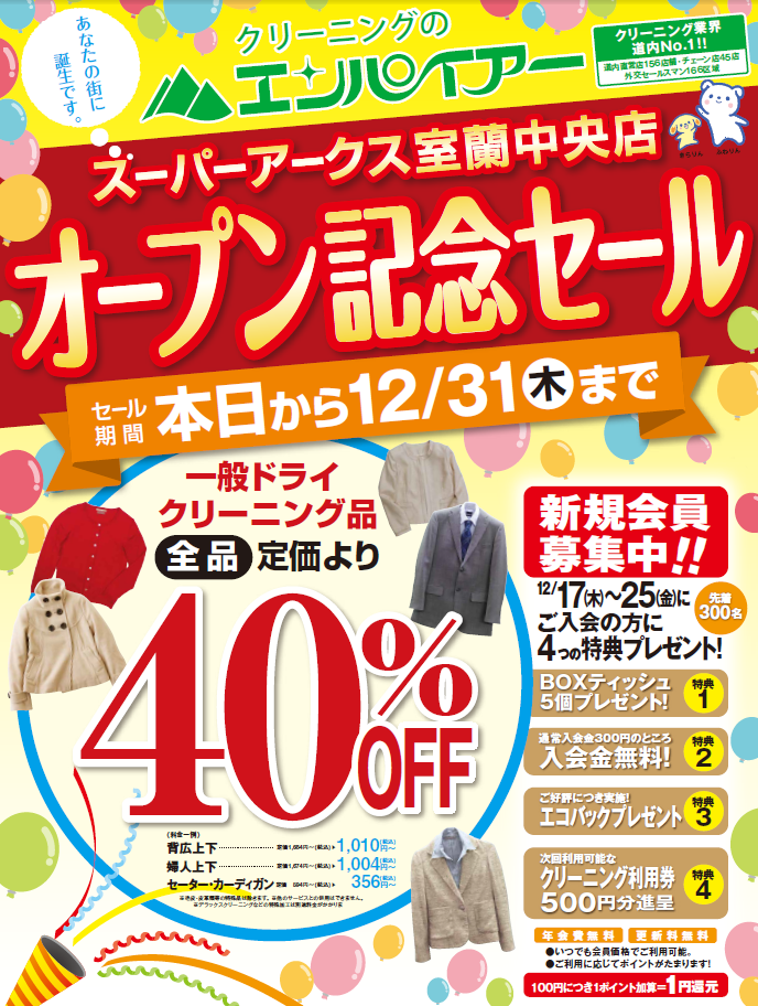 スーパーアークス室蘭中央店 12月17日(木) 新店オープン! 2015.12.17 12月17日(木)にスーパーアークス室蘭中央店がオープン致しました! オープンを記念して、セールや特典プレゼントもご用意しておりますので、是非お立ち寄り下さい! ご来店を心よりお待ちしております。 レジ袋 有料化のお知らせ 【店舗】リニューアルオープン!【ラルズマート北35条店】 お盆期間営業時間のお知らせ 【店舗】QUOカードPay が使えるようになりました! 【アピア店】3/17 リニューアルオープン!!【店舗】