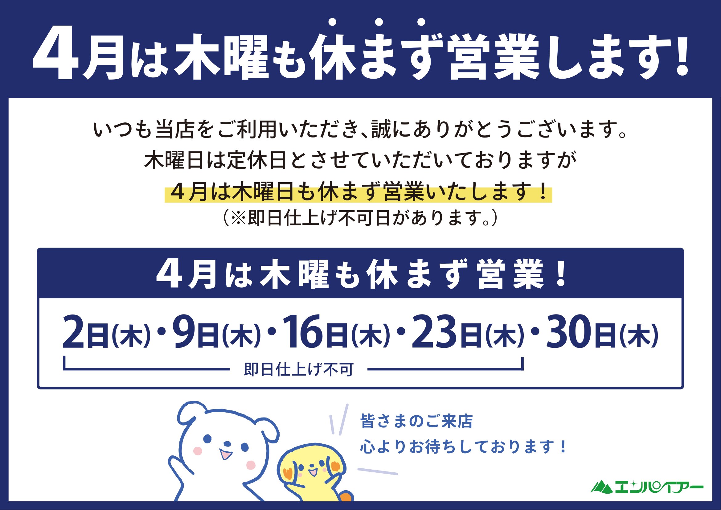 | 定休日 | ※4月は木曜も営業!※ 木曜 年末年始 |