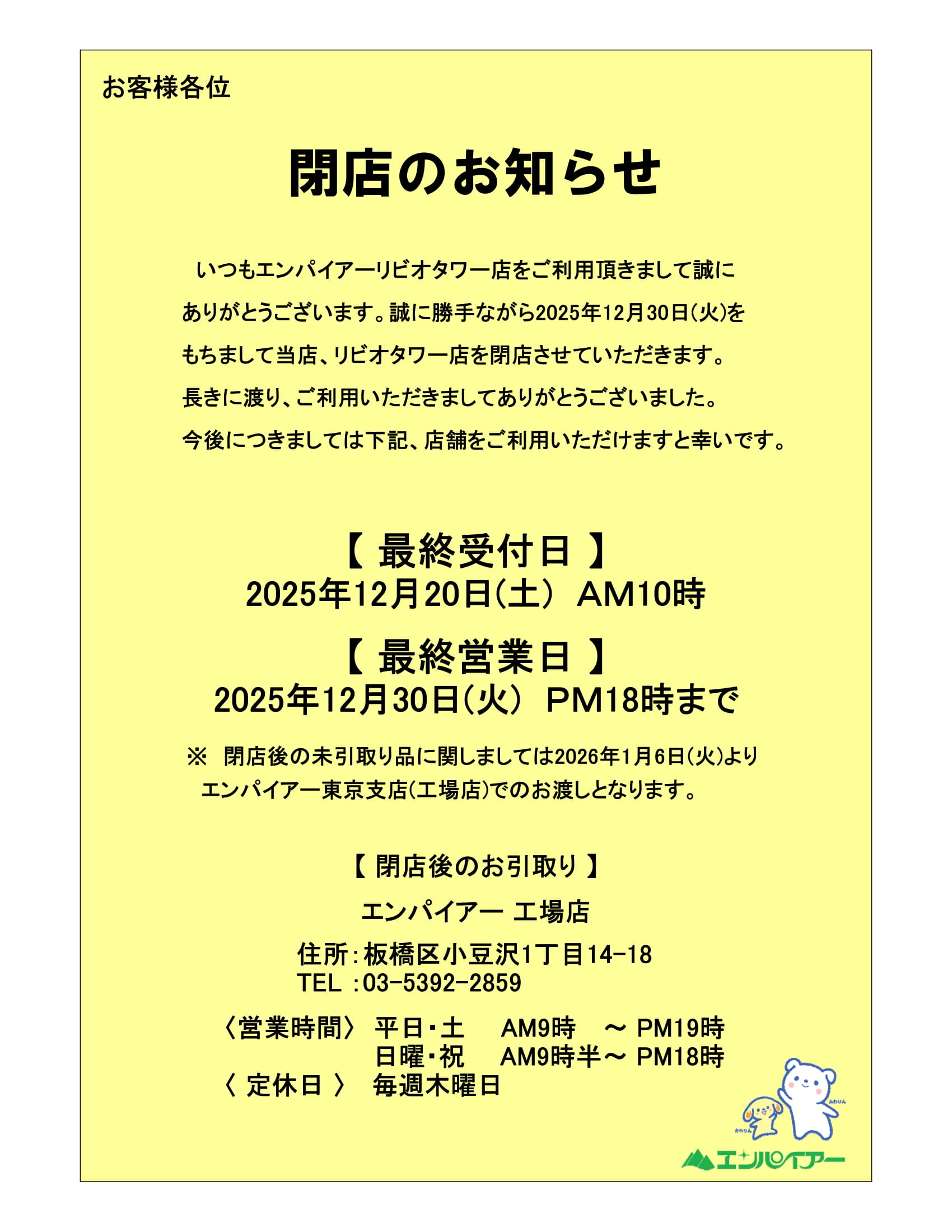 リビオタワー店 東京支店 住所 東京都板橋区板橋3丁目5-1リビオタワー1F 電話番号 営業時間 ~閉店いたしました~ 定休日 即日仕上げ時間 クレジット利用 電子マネー利用 設備 いつもリビオタワー店をご利用いただき 誠にありがとうございます。 リビオタワー店についてのお問合せはこちら エンパイアー東京支店:03-3969-5451
